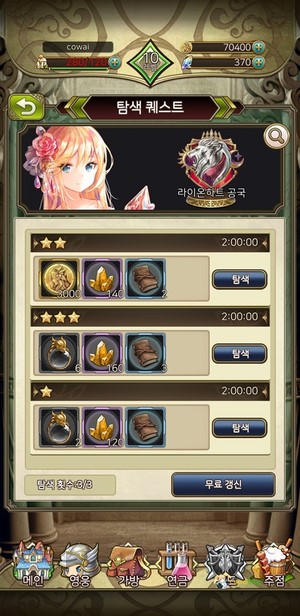 스테이지마다 다양한 아이템들을 획득할 수 있기 때문에 메인을 꾸준히 클리어를 하시면 보면 자신의 영웅들을 육성할 수 있는 아이템들을 획득하실 수 있겠습니다반대 상성일 경우에는 무려 데미지가 75%까지 반감되므로 영웅 등급에 대한 부분도 중요하지만, 가장 중요한 것은 상성과 전략적인 배치가 중요하다는 것을 실감할 수 있다