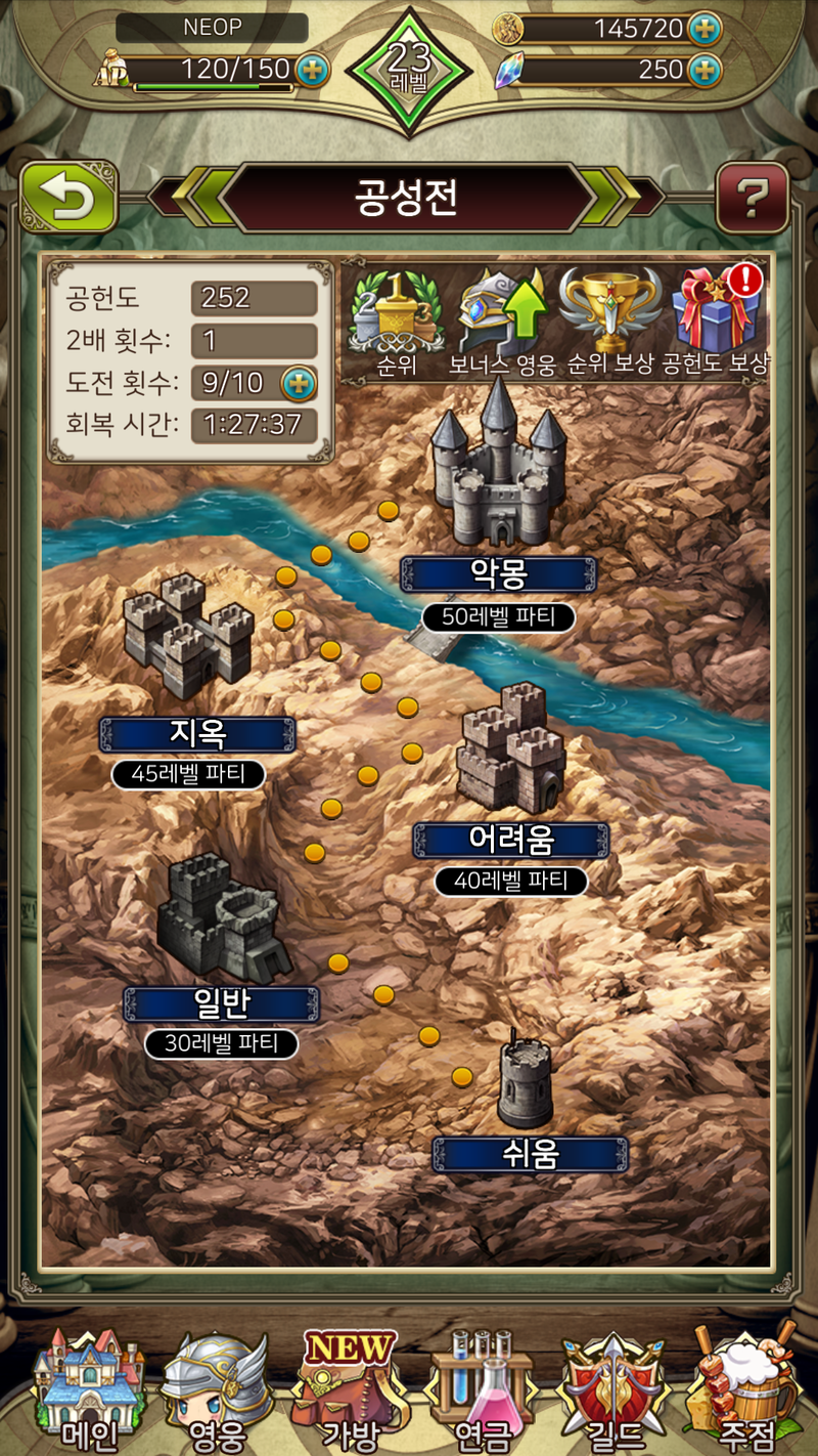 운영이 워낙 좋은 게임이라서 일일 출석과 누적 접속 이벤트 등 동시다발적으로 진행되고 있는 혜택을 잘 활용하시면 무과금으로도 재미있게 플레이하실 수 있을 것이다 예쁜 일러스트, 내 취향을 저격하는 영웅이라면 애정을 가지고 육성해보시길 권해드린다 일종의 맛보기로 즐기게 해주었다는 느낌이라고 할까? 빨리 파티 레벨 30까지 올려서 다음 난이도에도 도전을 해봐야겠다 근접캐, 원거리 딜러, 힐러! 5명이 파티이지만 이 3명이 우선 기본 구성이라서 각 직업별 1티어를 이야기하면 힐러는 멜디이다 그 이유가 인장 때문인데 인장을 어떻게 착용하냐에 따라서 근접 딜러는 탱커도 될 수 있다 한편 보너스 영웅을 3명 출전시킨 상태에서 공헌도를 252점 획득한 모습을 확인할 수 있다 어쩌면 당연한 이야기일 수 있는데 게임에 구현되어 있는 콘텐츠가 상당히 다채로워서 한쪽 계열, 예를 들어 보병만 육성하면 특정 콘텐츠에서 곤란함을 당할 수 있다 꾸준하게 공성전을 즐긴다면 상위 10%까지는 충분히 달성할 수 있기 때문에, 시즌마다 다이아 300개 보상을 꼭 챙겨가시길 바란다 (다이아는 내가 정말 꼭 원했던 영웅이 픽업으로 등장했을 때 사용하는 걸 추천) 하루에 3번 퀘스트 갱신이 가능하니 높은 등급의 퀘스트를 우선적으로 수행하도록 하자
