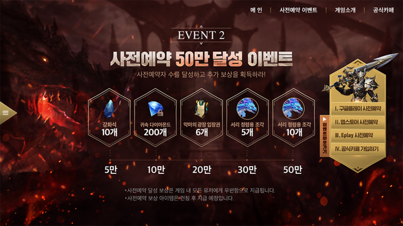 이후 5만부터 시작해 최대 50만명 까지 예약자 달성 이벤트로 강화석 10개와 귀속 다이아몬드 200개, 악마의 광장 입장권 6개, 서리 정령용 조각 총 15개를 추가로 획득하실 수 있는데요 아마도 카카오톡을 통해서 쿠폰이 왔을 텐데 사용하는 방법은 게임 화면 오른쪽 상단에 혜택 선물교환 쿠폰번호 입력을 하면 된다알려진 바로는 몰이 사냥에 특화되어 있어 손맛이 뛰어나고, 여러 장비들이 쏟아져 파밍하는 재미도 있을 거라고 하는데, 저 또한 핵 앤 슬래시라면 이런 화끈한 맛이 있어야 한다고 생각해서 빨리 런칭을 했으면 좋겠다는 생각이 드네요