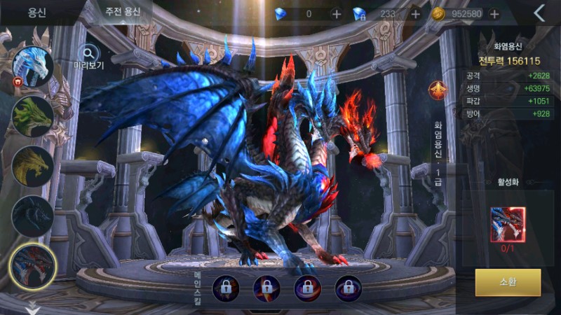 눈 여겨 볼 점은 용의 영혼을 선택받은 자는 인간의 모습으로도 전투가 가능하지만 드래곤으로 변신해 전투를 이어가는 모습이 보여지고 있다는 점으로 화려한 그래픽과 몰입도를 바탕으로 특별한 경험을 할 수 있을 것으로 여겨집니다 외형만 봐도 장비 맞추려고 노력한 게 한 눈에 보이지 않나요? 제가 어떻게 키웠는지 궁금해하시는 분들이 있을 것 같아 전체적으로 알려드리도록 합니다 여섯 개의 신기를 모아 용신을 깨우치면 전투 과정에서 용신에게 위력을 석방할 수 있는 용신 기술을 사용해 변신이 가능하더라고요 각각의 캐릭터마다 고유의 특징이 있기에 어떤 캐릭터가 가장 좋다 말씀드리긴 어렵고 개인의 취향에 맞는 캐릭터를 선택하시면 될 듯합니다