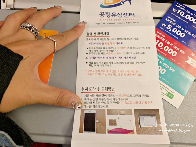 파란색 도시락통안에는 작은 본체에 충전기, 설명서, 휴대폰에 연결가능한잭, 면세점에서 이용할수있는 각종 쿠폰이 들어있네요 사실, 베트남은 워낙 유심칩이 저렴해서 저흰 4인 베트남가족여행도 각자 유심칩을 샀습니다 저는 3명이었기 때문엔 7인용 승합차를 이용했어요