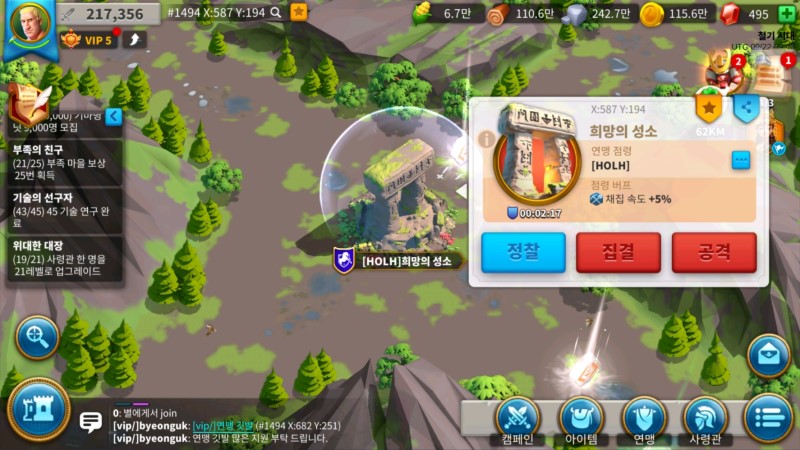 그런데 단순히 병력만으로 승부를 내는 단순한 전쟁이 아닌 진형이나 매복 다양한 전술을 사용해서 적을 상대할 수 있다는 전략적 플레이가 가능하다는 점도 상당히 인상적입니다 그 외에도 연구를 진행할 수 있는 아카데미나 정찰병 영지, 혈맹센터, 주점 등 다양한 건물을 건설하고 업그레이드하는 재미가 있네요