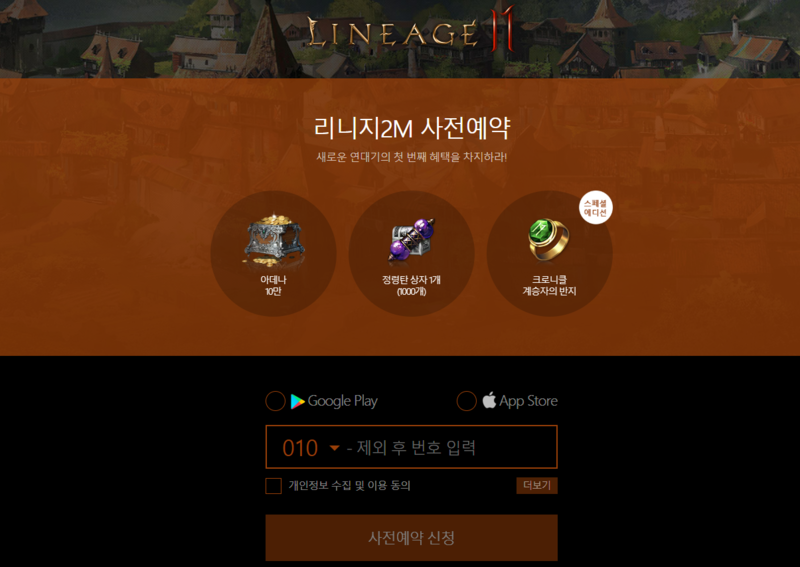 Android, IOS 디바이스 유저 모두 참여할 수 있으며, 각 마켓 추가 사전 등록을 통해 정령탄을 500개 추가로 획득할 수 있겠습니다 사전예약이 시작했다는 것은 곧 사전 캐릭터 생성과 정식 론칭까지 시간이 그리 오래 걸리지 않을 것 같다는 추측과, 본격적인 찬바람이 불기 시작할 때 리니지2M을 스마트폰을 즐길 수 있을 것이라는 이야기로 풀이된다 리니지2 원작을 플레이하셨던 분들은 리메이크 작품을 한다는 느낌으로, 그렇지 않은 분은 웰메이드 모바일MMORPG를 한다는 느낌으로 즐길 수 있을 것 같다 앞서 말씀 드렸다시피 이번에는 충돌 처리 기술을 적용한다고 어필하였으니 102,500,000제곱 미터에서 펼쳐지는 대규모 결투를 기대해봐도 좋을 것 같더군요 쇼케이스 행사에서 이성구 총괄 프로듀서는 원작 클래스가 모두 등장하며, 타르카이 등 설정에만 있었던 클래스도 새롭게 등장할 것이라고 소개했다 말하는 섬 선착장에서 정체를 감추려는 듯 붉은 후드를 뒤집어쓴 채 조심스레 걸음을 재촉하는 모험가, 단신으로 여러 명의 오크족을 처리하는 다크엘프의 모습이 차례대로 조명된다 대규모 전투에서 활용 할 수 있을 것으로 보이는 와이번과 공성 병기 등에 대한 추측까지 다양한 관점으로 영상을 확인할 수 있었습니다 사전예약의 경우 특이하게 양대 마켓 사전등록을 진행 중으로 리니지2M 공식 사이트를 통해 사전예약 시 아데나 10만, 정령탄 상자 1개(1000개), 크로니클 계승자의 반지를 지급하며 구글 플레이와 앱스토어를 통해 사전예약을 진행할 경우 정령탄 상자 1개(500개)를 추가 지급받을 수 있다고 봅니다 그레시아군이 침공 당시 주둔했던 야영지로 퇴각할 때 남은 군영물을 낙오된 올 마흠 용병들이 거주지로 사용하고 있는 지역이라고 합니다 공/홈에는 아데나 10만에다가 정령탄 일천 개, 크로니클 계승자 반지를 준다고 하면, 이렇게 앱마켓 종류인 구/플이나 앱스토어에서는 각각 정령탄 500개를 준다고 하니