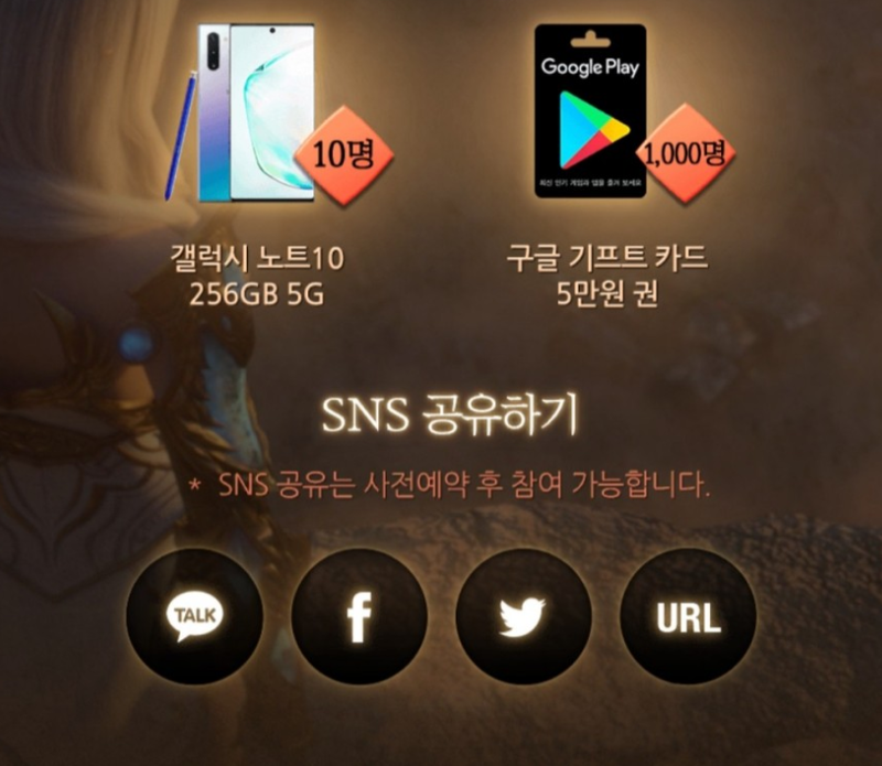 카카오스토리, 페이스북, 트위터등을 이용해 SNS에 사전예약 소식을 공유하면 추첨을 통해 10명에게는 갤럭시 노트 10 256GB 5G가 주어지고 1000명에게는 구글 기프트 카드 5만원권이 주어집니다