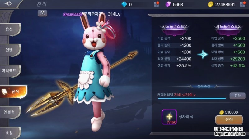 하지만, 이런 상위 컨텐츠나 시스템도 일단 개방 되는 레벨까지는 키워야 기대를 하든, 평가를 하든 하겠죠? 실제 개인적으로도 아무리 레벨이 빨리 오르는 게임이라곤 하나, 일정 수준부터는 급격히 성장 속도가 더뎌지기 때문에 초보 입장에서는 이런 후반 컨텐츠들이 그다지 와닿지 않는 경우가 많습니다 클래스 변경은 마스터 1LV(400레벨) 달성 후 오픈이 되기 때문에 저도 열심히 플레이해서 최대한 빨리 400레벨까지 가서 클래스 변경을 목표로 하고 있겠습니다 이번 마검사는 약 70만 정도의 전투력까지 한번 도전해 볼까 하는데, 긴 시간이겠지만 마검사가 업데이트 된 만큼 충분히 도전할 만한 가치가 있다고 생각하다