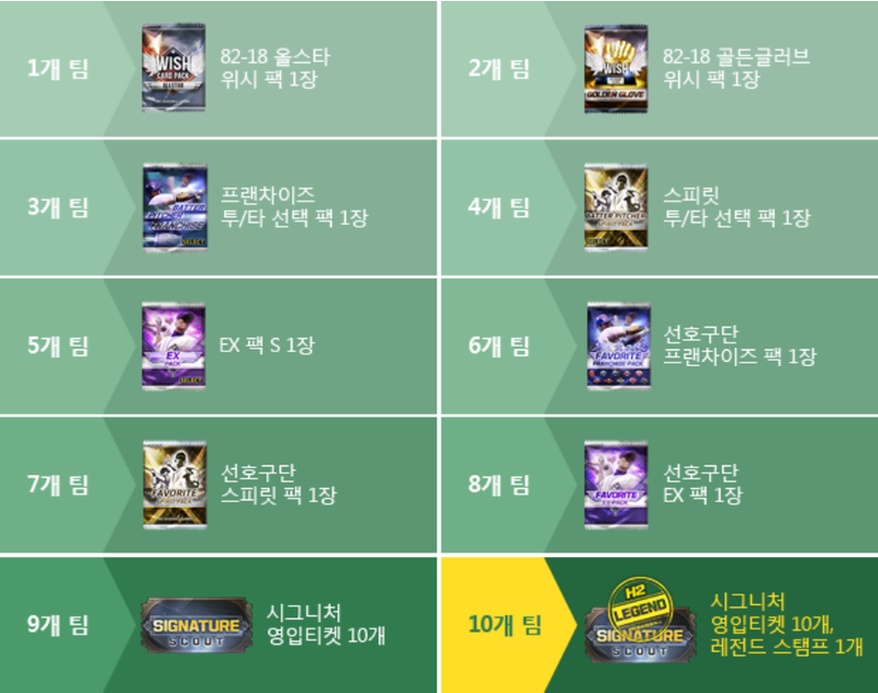 맞춘 팀 개수에 따라 시그니처 영입 티켓, 앨범 스탬프 레전드, 선호구단 익스 팩, 스피릿 팩, 프랜차이즈 팩 등을 지급한다고 하니 꼭 참여해야겠다