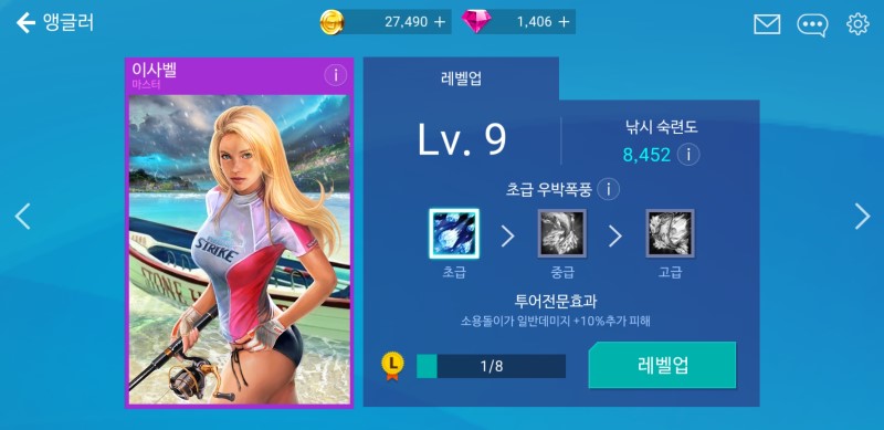 보트 선택 후 투어를 도와줄 앵글러까지 준비를 하게 되면 낚시를 시작할 수 있는데 여기서 앵글러는 숙련도를 높여주고 물고기에게 더 많은 피해를 입힐 수 있는 일종의 보조 캐릭터라고 보시면 되겠습니다 판매를 하게 되면 MAX 성장 보상없이 바로 판매금액을 받을 수 있지만 수조에 여유가 있다면 이런식으로 MAX레벨까지 올려 보상을 받아주시면 됩니다