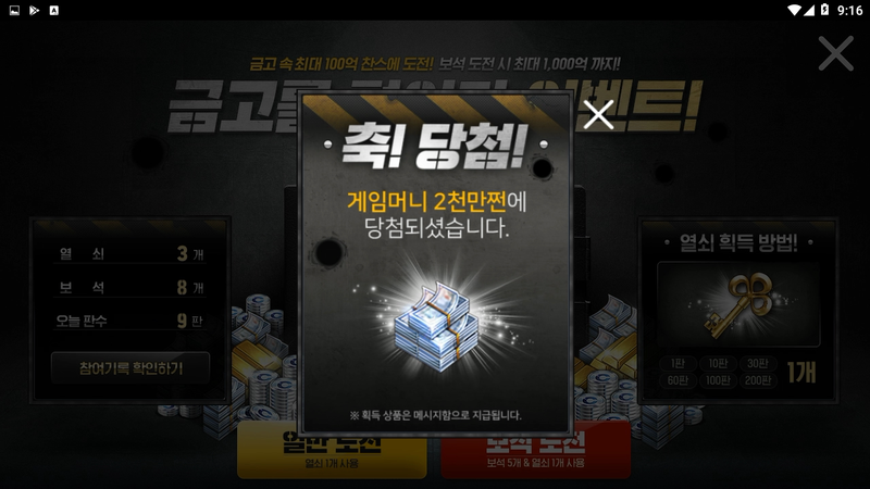 열쇠만 사용하는 일반도전을 통해선 최대 100억 쩐까지, 보석5개를 추가로 사용하는 보석도전으로는 최대 1000억 쩐까지 보상으로 받을 수 있겠습니다 중간마다 발생하는 배짱승부는 패를 뒤집은 채 쩐을 높여가면서 최후까지 남은 인원이 승패를 보는 말 그대로 배짱 있는 사람만 남는 판입니다