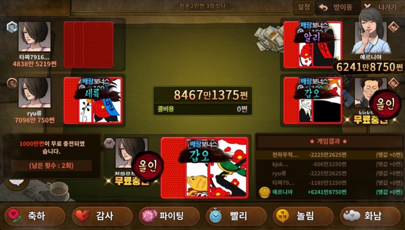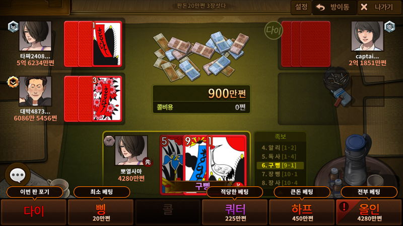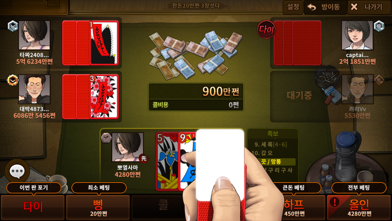 게다가 동양화 카드의 경우 명절 때 가족들끼리도 재미 삼아 려어 판 플레이를 하는 게임이다 보니까 기본 룰은 다들 숙지하고 있을 겁니다 3천만 쩐부터 고급 뽑기통, 단아한 김단정, 5천만 쩐 등 다양한 혜택을 요일 마다 받아볼 수 있으니 꼭 푸짐한 보상 받아가시길 바랍니다 본인의 두 번째 패가 안 좋게 나오더라도 처음부터 판돈을 크게 가져가면 상대방으로부터 얘 뭐지? 뭐 있나?라는 의구심을 들게 하기 때문에 꽤 승률이 좋더라고요2장 섯다는 가장 일반적인 방식으로 한장을 먼저 받고 배팅을 시작한 후 마지막 히든패를 받아 두장으로 족보완성 및 승부를 지어야 하는 룰을 가지고 있겠습니다 처음 게임을 시작할 때 고를 수 있는 4가지 캐릭터도 굉장히 매력 넘치고 성우 목소리도 나오기 때문에 착착 붙는 맛을 더해준다